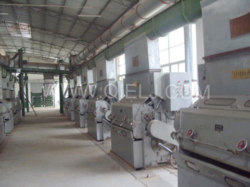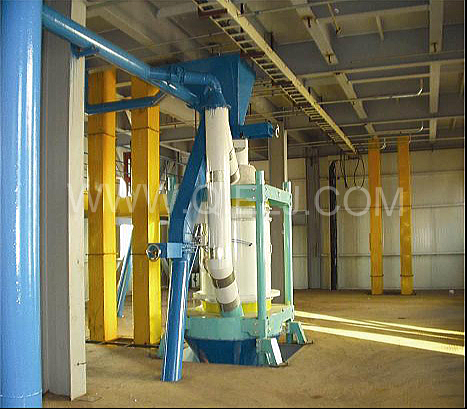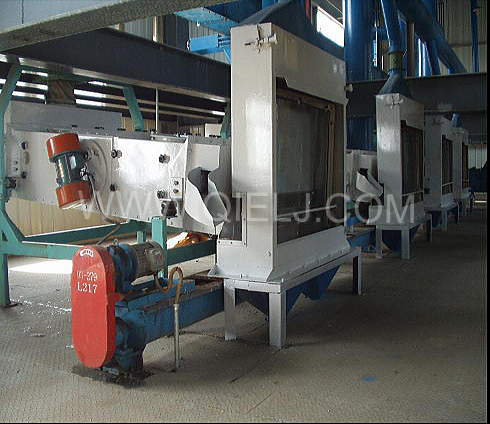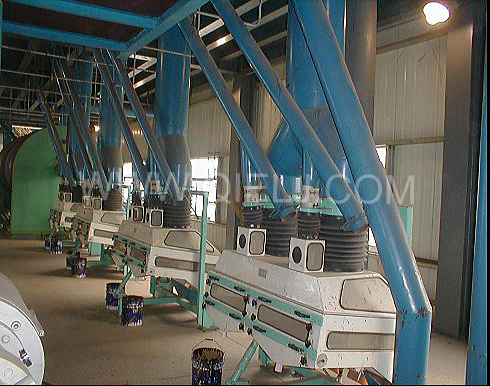 清理工序:采用磁選器去除鐵雜;振動(dòng)清理篩去除大雜、秸稈等;比重去石機(jī)去除石子和磚塊等重雜;除塵系統(tǒng)采用單聯(lián)剎克龍以及離心風(fēng)機(jī)進(jìn)行有效的除塵,以保證車間衛(wèi)生和清理輕雜。